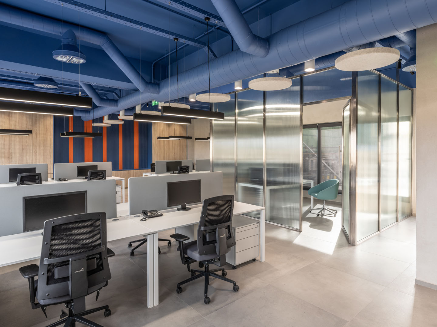Η ανακαίνιση των γραφείων για εταιρεία ενέργειας αποτελεί έναν σύγχρονο και καινοτόμο σχεδιασμό που συνδυάζει τη λειτουργικότητα με την αισθητική. Ο σχεδιασμός περιλαμβάνει open space διαρρύθμιση που ενισχύει τη συνεργασία, ενώ τα ημιδιαφανή γυάλινα χωρίσματα και οι ηχοαπορροφητικές λύσεις εξασφαλίζουν την ιδανική ακουστική και οπτική ισορροπία. Η industrial μπλε οροφή προσδίδει έναν δυναμικό χαρακτήρα, ενώ το custom terrazzo, σχεδιασμένο ειδικά στις αποχρώσεις της εταιρείας, αποτυπώνει την προσοχή στη λεπτομέρεια. Ειδικοί χώροι, όπως το booth για ιδιωτικές συναντήσεις και το laptop area, προσφέρουν εργονομία και ευελιξία ενώ το έργο στο σύνολό του συνδυάζει τη βιομηχανική αισθητική με την πρωτοποριακή λειτουργικότητα.