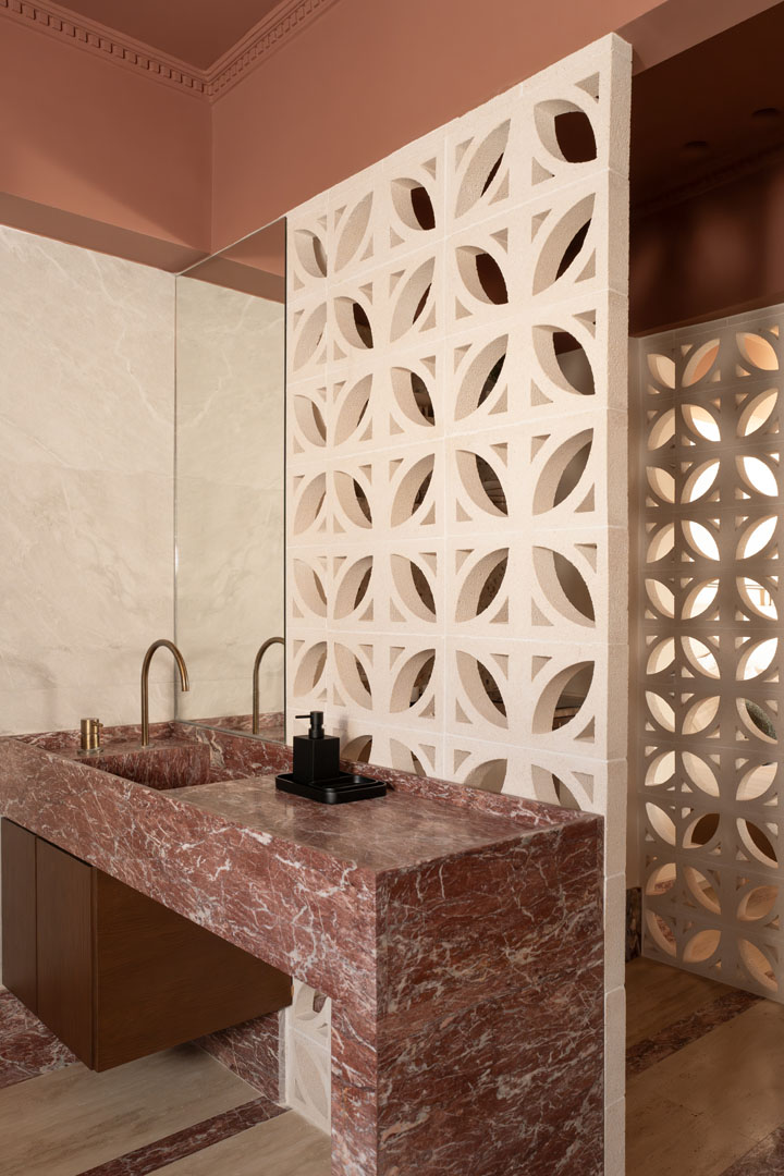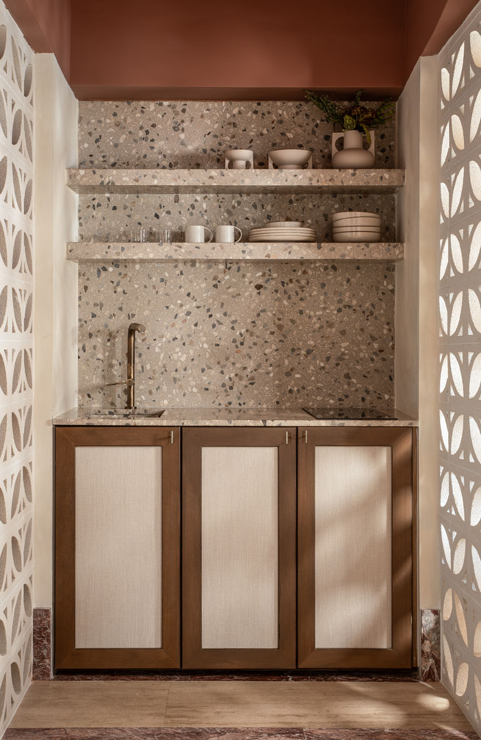 A standout feature is the claustra—a perforated architectural element—that subtly divides the living areas from the kitchen and bathroom. This “limit without limits” adds texture, character, and a touch of Mediterranean charm, while preserving the openness of the layout.