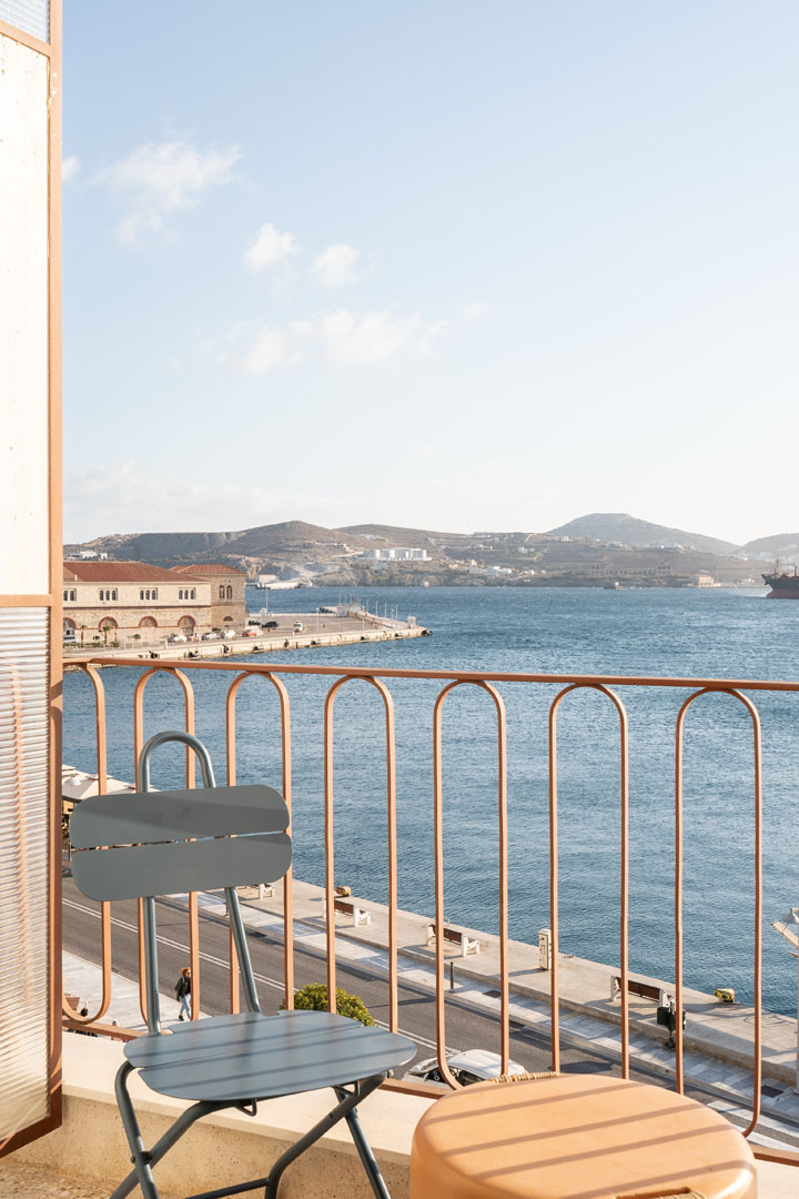 What truly sets this home apart are its views: from one side, large windows and a balcony overlook the bustling port and historic shipyard, while on the other, a perfectly framed window captures the old town. Every detail has been carefully designed to connect the home to its surroundings, making this apartment a true reflection of Syros—rooted in history, yet perfectly suited to modern living.
