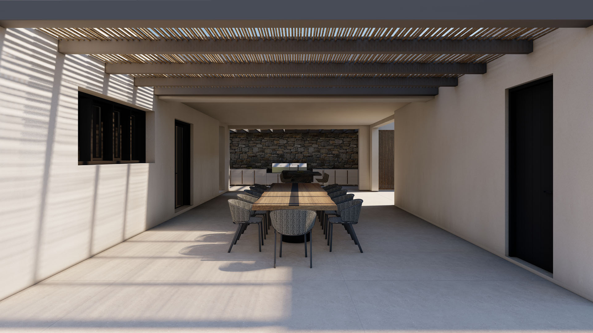 The residence unfolds around the outdoor living areas, where the infinity pool and shaded pergolas form the core of daily life. Light and shadow interplay across the surfaces, emphasizing the building’s connection to its natural surroundings, while the interiors maintain a restrained aesthetic focused on functionality and comfort.