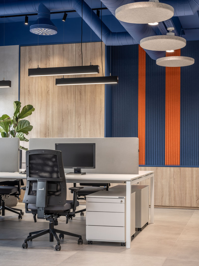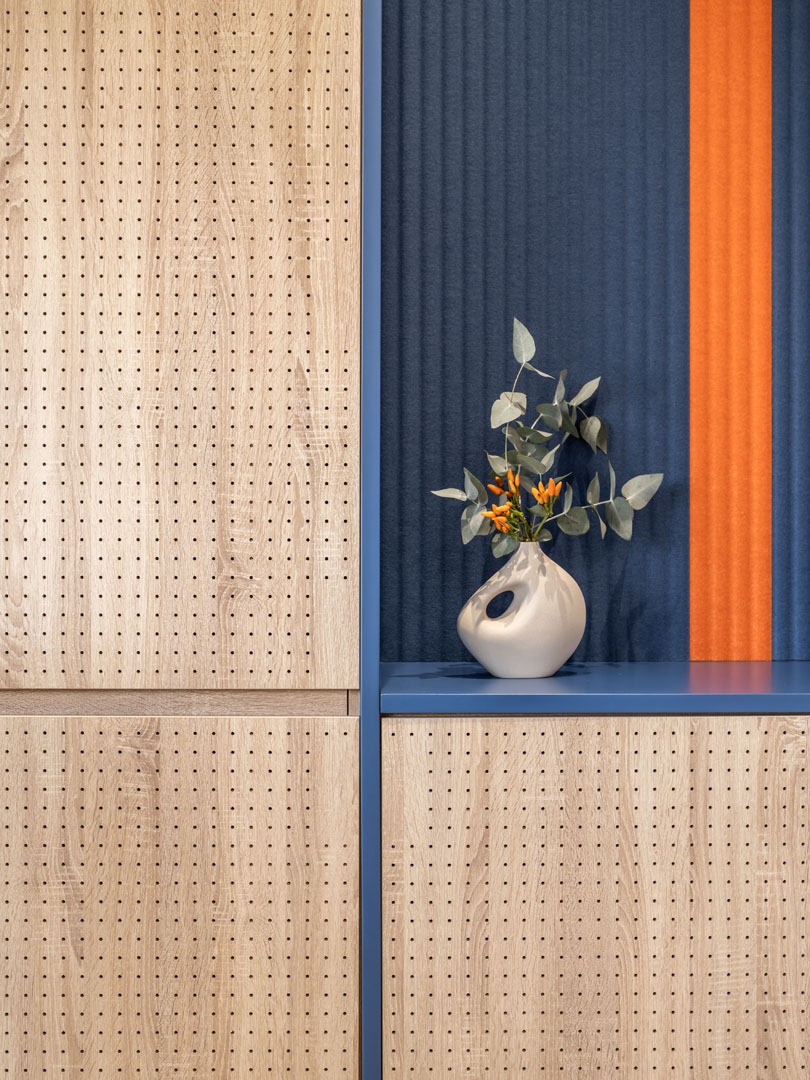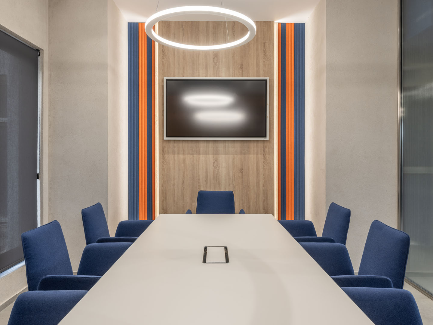 In the meeting room, acoustic materials on the ceiling ensure sound control for productive work sessions. Additional perforated details on furniture and storage, combined with acoustic wall and ceiling panels, improve sound management and create a comfortable atmosphere.