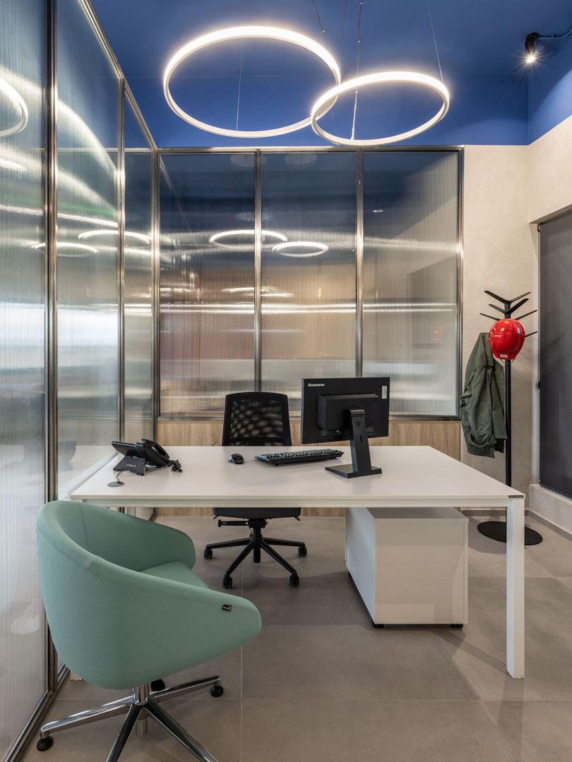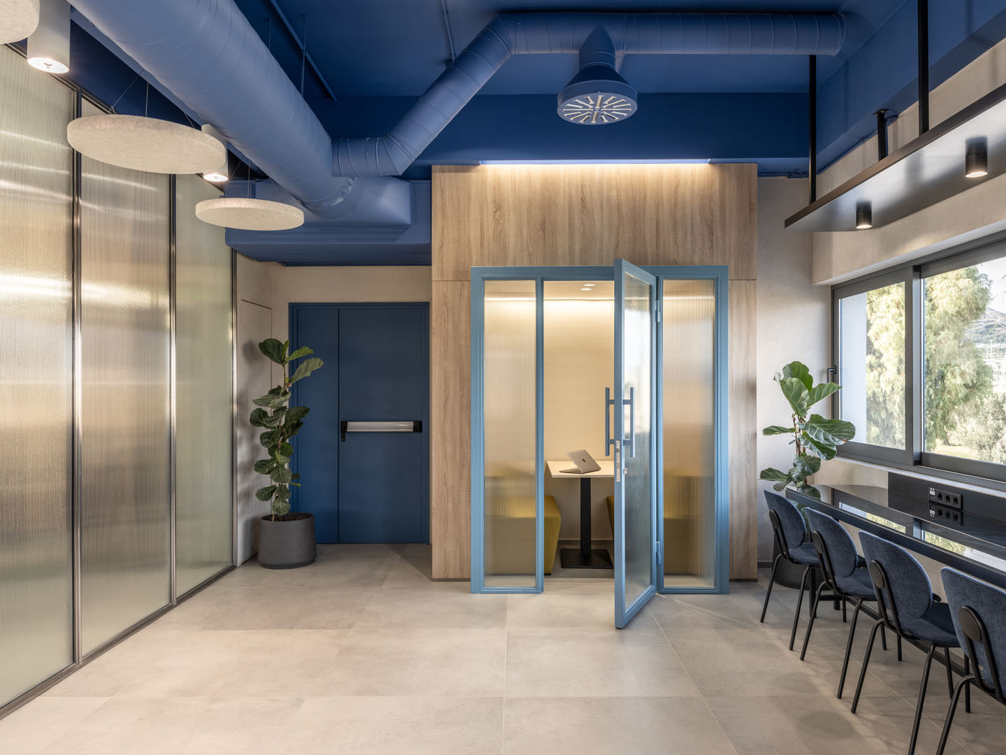 A key feature is the industrial blue ceiling, which gives the interior a bold and dynamic character, while exposed ducts and integrated lighting add to the contemporary architectural expression. Semi-transparent glass partitions define boundaries without blocking visual continuity, enhancing the sense of openness.