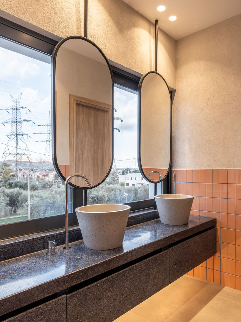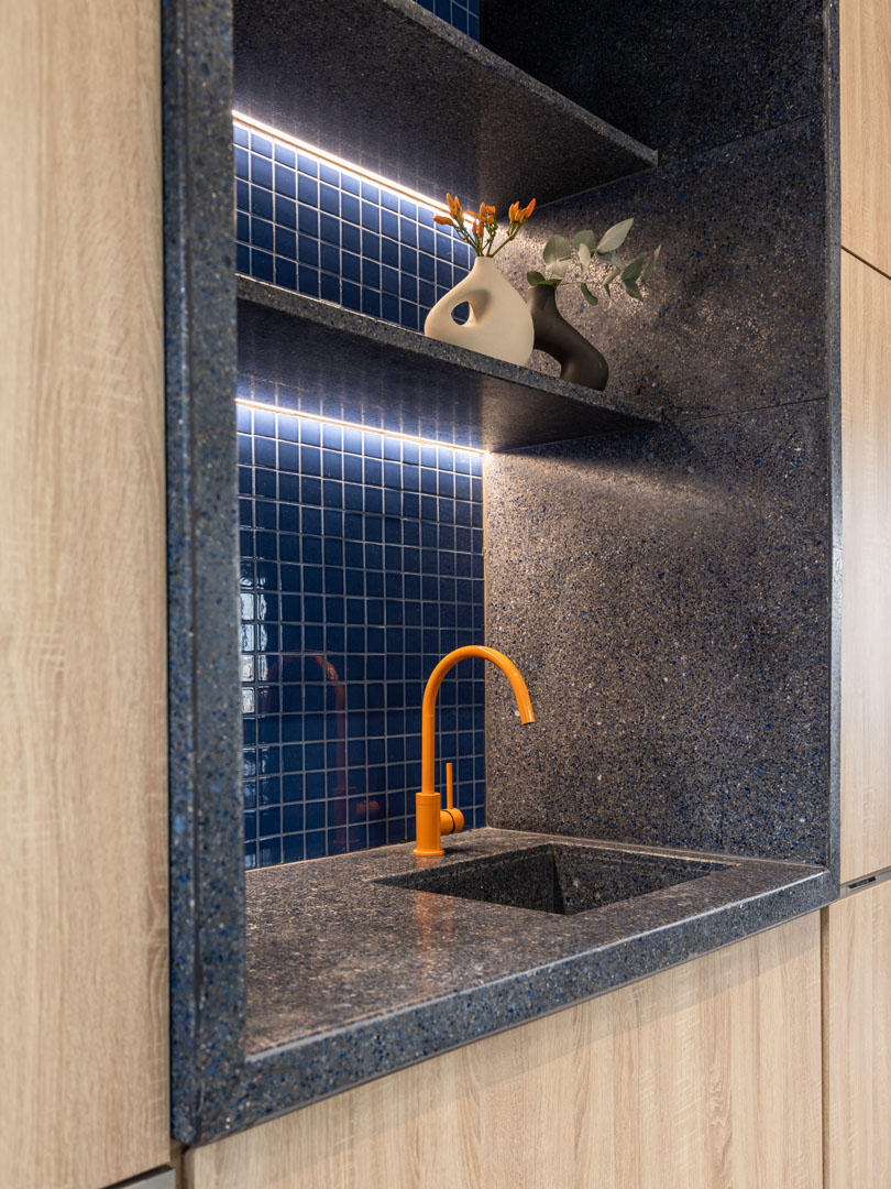 Material choices add refinement and precision to the design. Custom terrazzo on kitchen and bathroom counters introduces texture and subtle elegance, while the balanced tones and patterns highlight attention to detail.